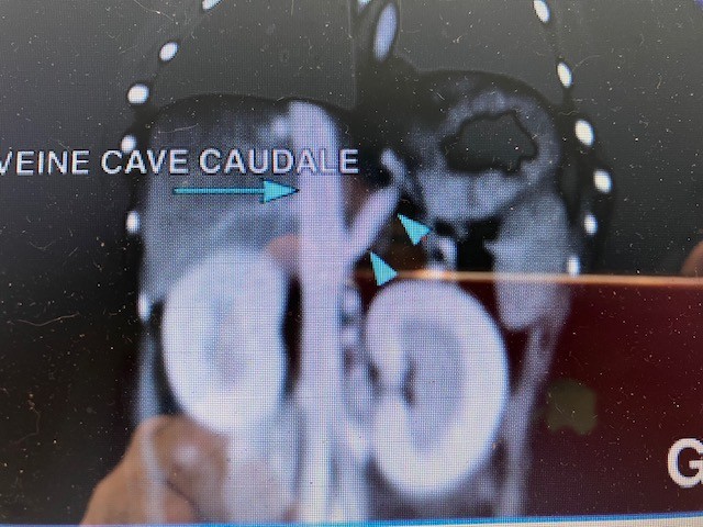 L’angio-scanner nous permet de confirmer notre diagnostic échographique, en nous apportant des images très précises de l’anomalie vasculaire. Cela va beaucoup nous aider pour envisager notre chirurgie. On voit ici très bien le vaisseau ( pointe de flêche ) qui part de notre veine cave, en aval des deux reins, sur le côté gauche. ( Merci au service d’imagerie de Zebrasoma )