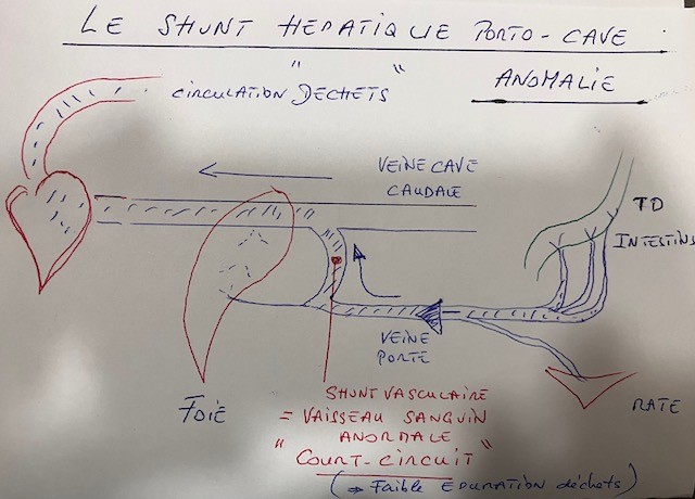 Nous nous orientons vers une suspicion de Shunt Porto-systémique, soit une anomalie du développement vasculaire affectant le système porte hépatique, entrainant un court-circuit vasculaire du foie, à l’origine d’une accumulation de toxines endogènes provenant de la digestion.